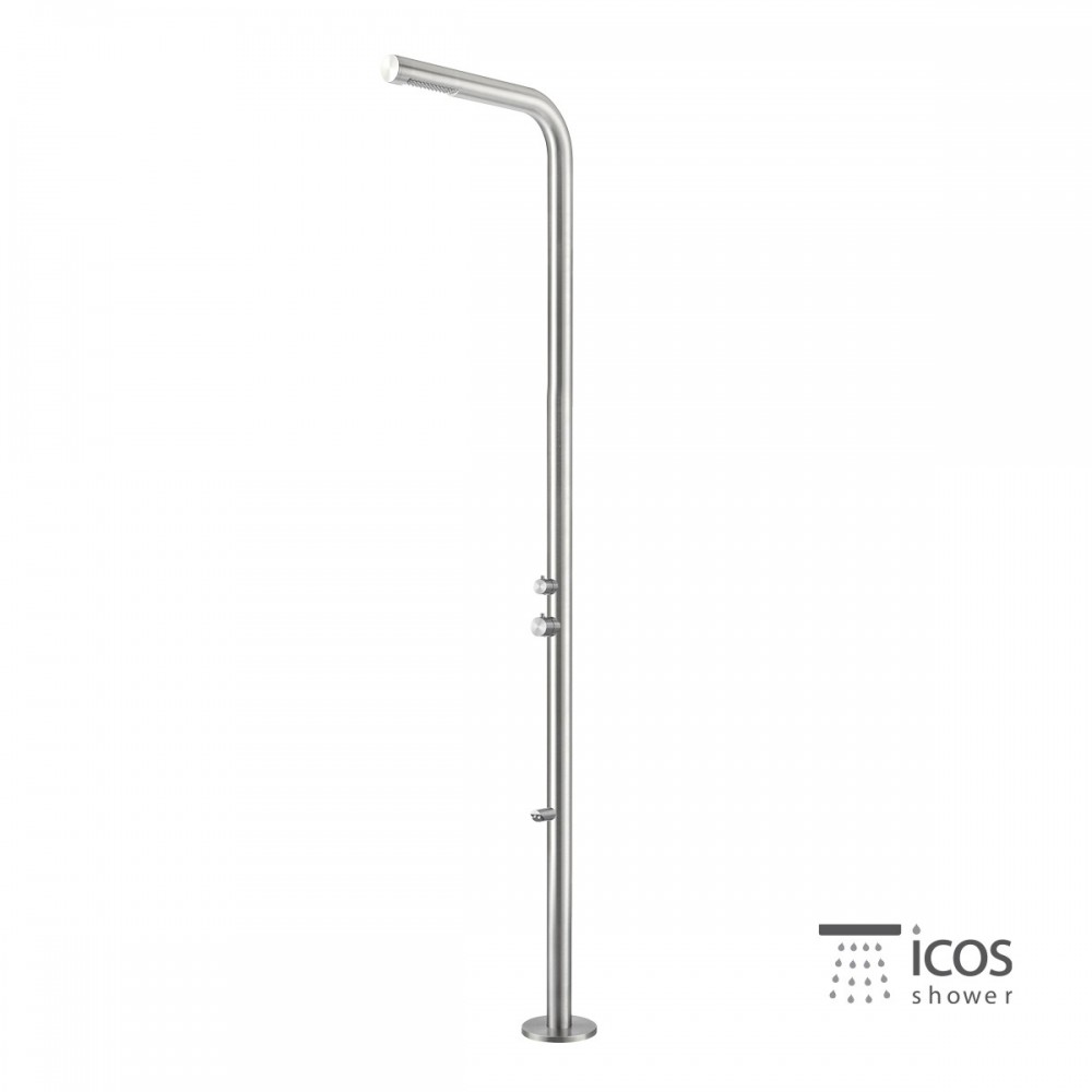 Στήλη ντους θερμομικτική εξωτερικού χώρου DONA ΜΙΧ ICOS SHOWER ύψους 220 εκ. από ανοξείδωτο χάλυβα Inox AISI316. Με 2 εξόδους: ντους κεφαλής και τηλέφωνο. Με ενδοδαπέδια βάση σύνδεσης (control box).